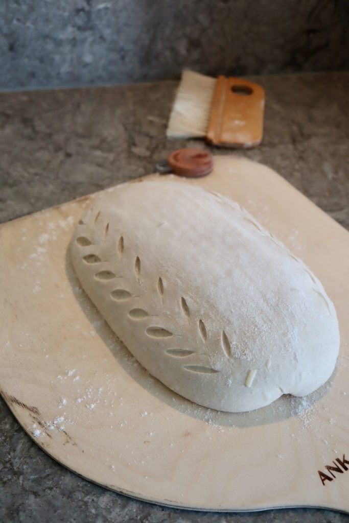 Ta ut bröden ur jäskorgarna och mjöla ytan lätt så glider snittkniven lättare på degytan. Snitta först mönstret och grädda sen i 5 minuter innan du gör det sista långa snittet utmed brödet. Grädda sen i ytterligare 15-20 minuter tills ytan fått en fin färg.