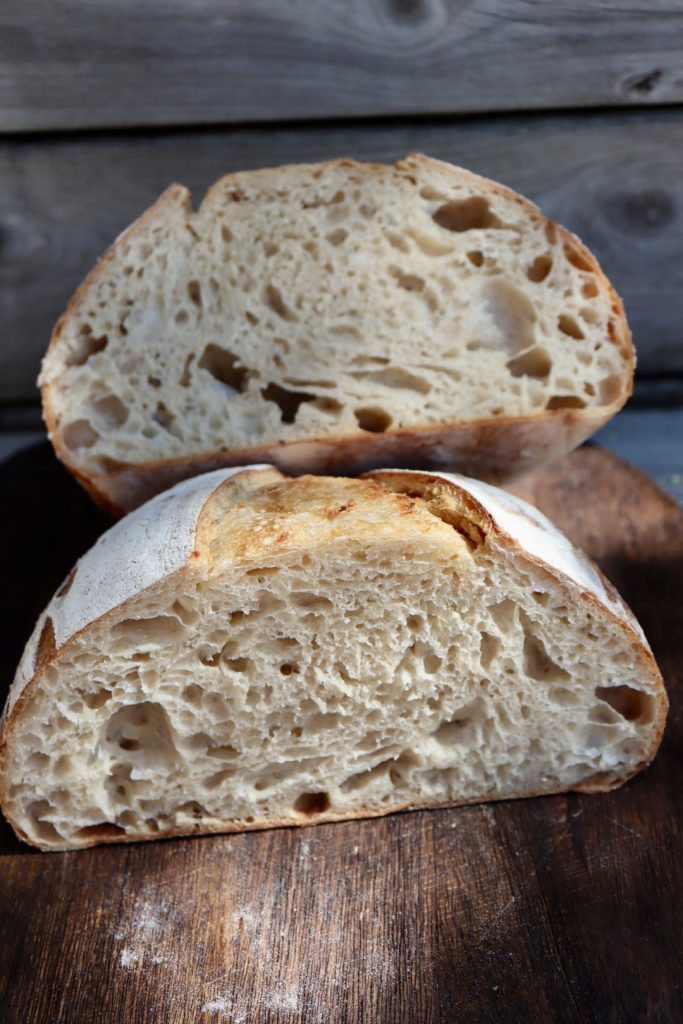 Ta sen ut degen ur bunken på mjölat bakbord och dela upp i två lika delar och forma till runda bollar. Låt ligga på köksbänken i ca 20 minuter utan att täcka över dem. Forma sen varje boll till ett bröd genom att vika det tight för att skapa spänning i degytan. Jobba med lätta händer för att bevara så mycket som möjligt av degens luftiga struktur. Placera varje bröd i en jäskorg och täck med plast eller vaxat bomullstyg.
